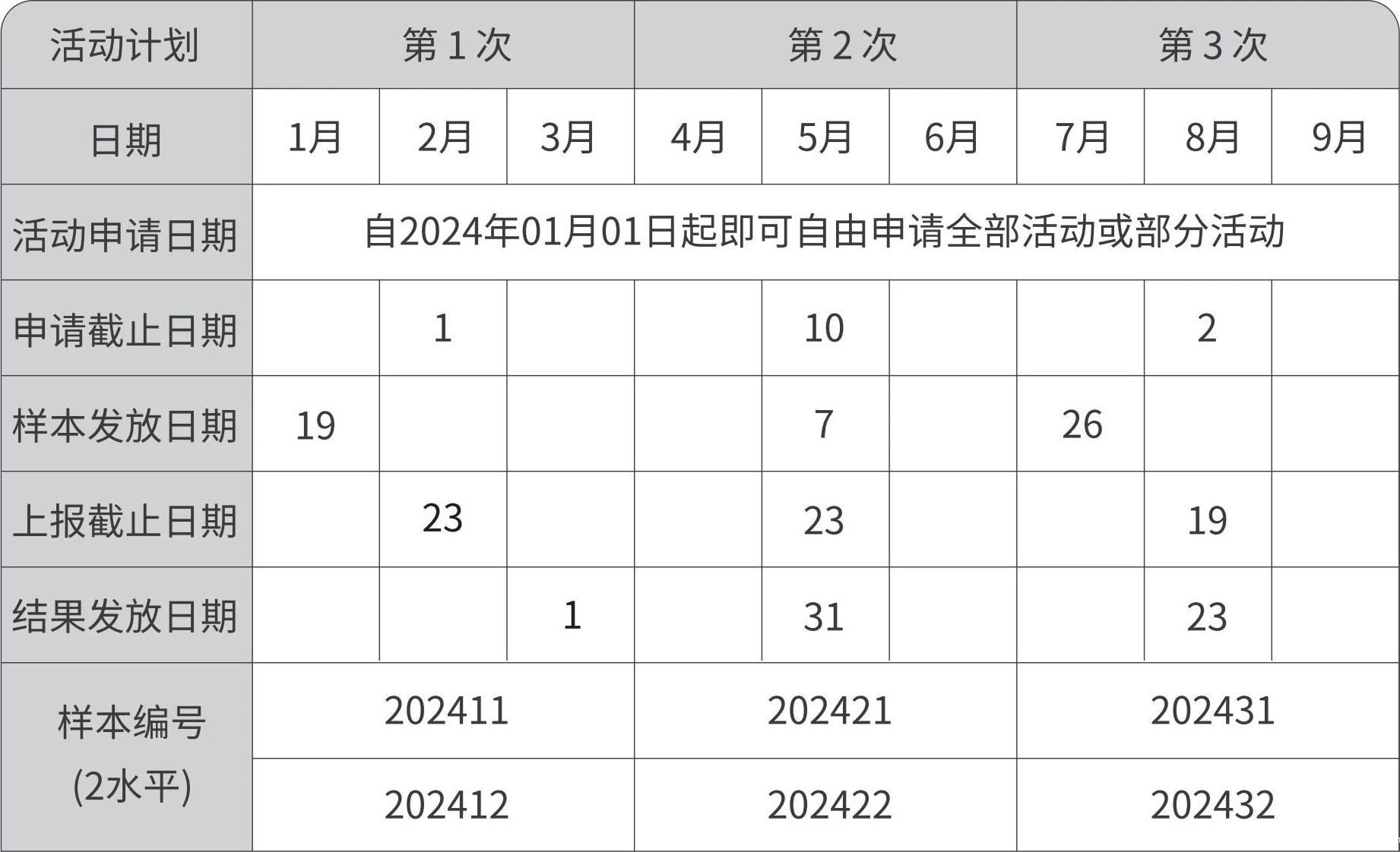 2024年世界杯直播质量评价计划全年开展3次,每项活动每次发放2个浓度水平样本各1支。开展的活动及项目具体如下: