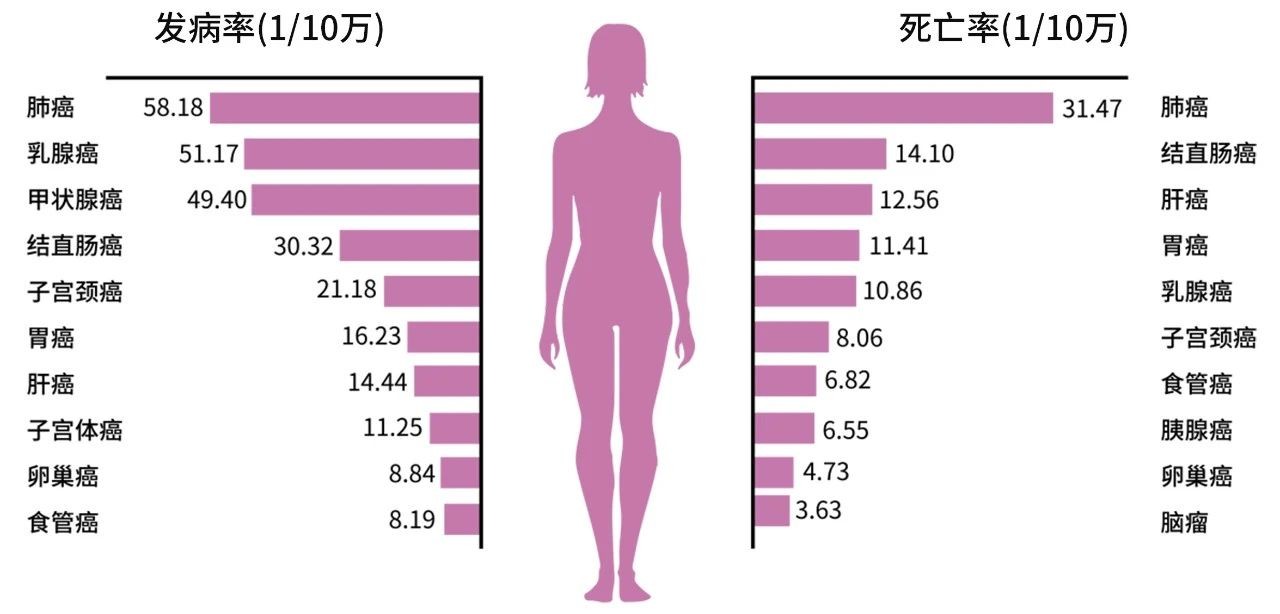 国家癌症中心基于肿瘤登记及随访监测**数据,在JNCC上发布了2024年全国癌症报告《2022年中国癌症发病率和死亡率》。数据显示:2022年,我国癌症新发病例约482.47万人,其中女性229.08万例,占新发病例数的47.5%;我国癌症死亡病例约257.42万人,其中女性94.49万例,占死亡总数的36.5%。尽管在发病率和死亡率上男性略高于女性,但是在年龄分布上,男性在25-54岁的发病率低于女性,女性患癌年龄趋于年轻化。所以,有必要提前了解,远离高发癌症!