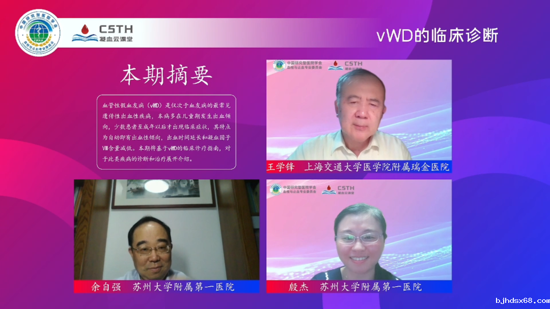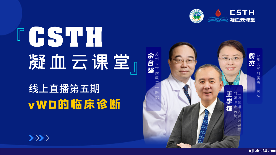 本期《vWD的临床诊断》邀请到了来自苏州大学附属第一医院的殷杰教授作为主讲嘉宾,由上海交通大学医学院附属瑞金医院王学锋教授担任本期主持人,特邀苏州大学附属第一医院余自强教授作为嘉宾参与讨论。