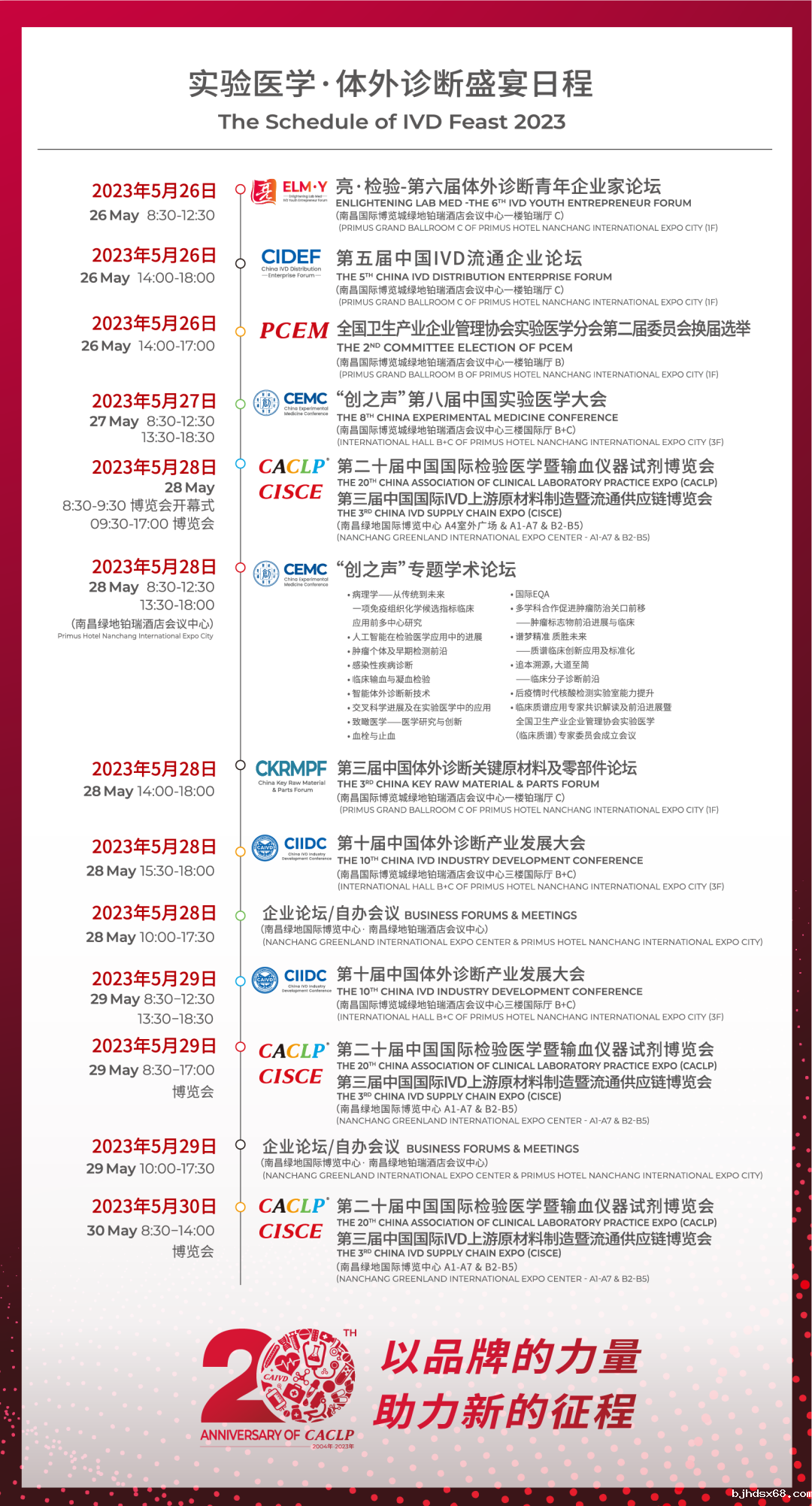 第二十届中国国际检验医学暨输血仪器试剂博览会(CACLP),第三届中国国际IVD上游原材料制造暨流通供应链博览会(CISCE)将于2023年5月28日-30日在南昌绿地国际博览中心举行。