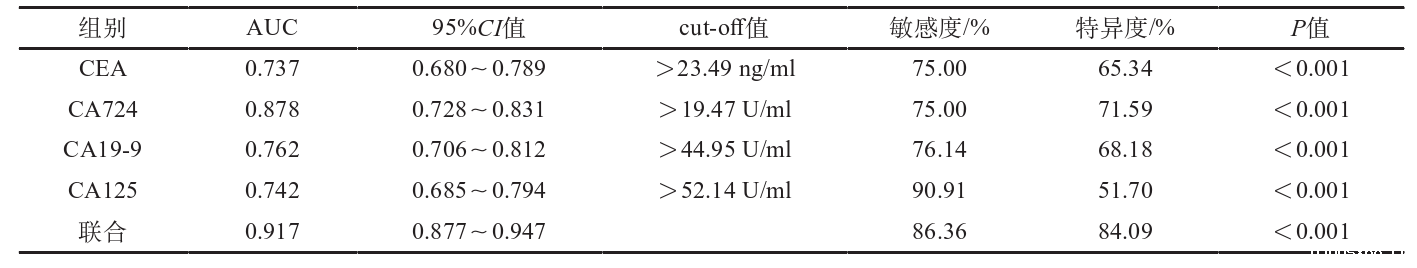 研究表明,血清CA72-4联合CEA、CA19-9、CA125诊断胃癌的AUC大于各指标单独诊断,灵敏度、特异度分别为86.36%、84.09%,表明血清CA72-4、CEA、CA19-9、CA125 联合可提高胃癌诊断价值。