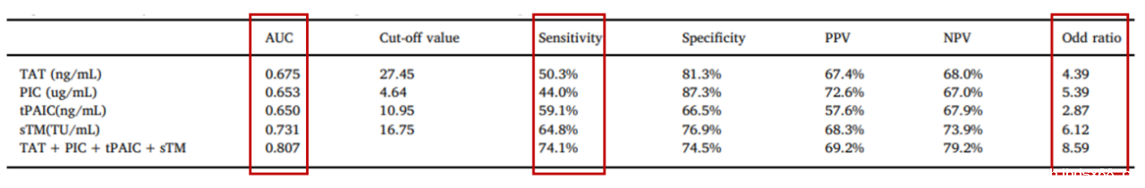 一项多中心前瞻性观察研究表明TAT、PIC、tPAIC和sTM在不同基础疾病的DIC患者中表现出良好的诊断性能和预后价值,TAT、tPAIC和sTM在pre-DIC的诊断具有一定的意义。此外,新血栓四项联合检测可增加AUC、灵敏度和优势比,具有更高的检测效能,有助于及时干预。